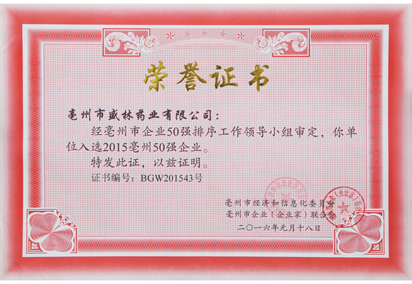 2015 Bozhou Top 50 Enterprise Honorary Certificate